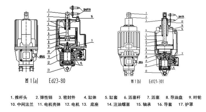 2、如果推動器存放時(shí)間較長((超過6個(gè)月),使用前應(yīng)拆下注油螺塞(參見圖1中14),檢查下油位是否正常。如果油位沒有達(dá)到規(guī)定位置(推動器垂直放置時(shí),加油口油滿為止),應(yīng)加注油至規(guī)定的油位,否則推動器將不能正常工作。